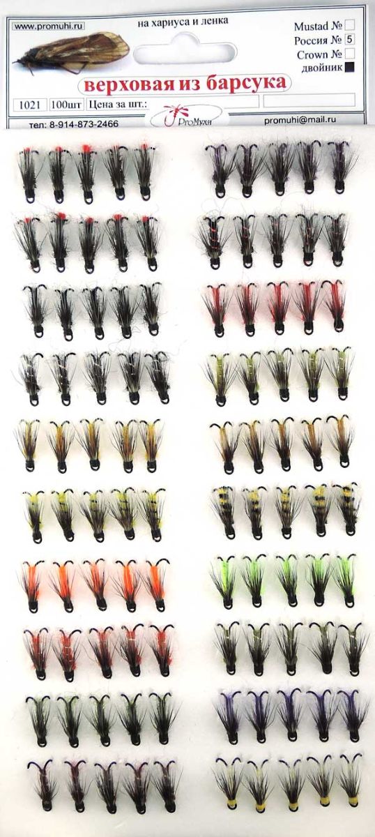 Верховая мушка из барсука на двойнике (двойном крючке). Выпускается в двух размерах. Шерсть барсука основной материал для крыльев верховых мушек у рыболовов Сибири и Урала. Проверенный вариант дающий стабильный результат. 100 мушек двадцати самых ходовых цветов. Крючок: Российский двойник.