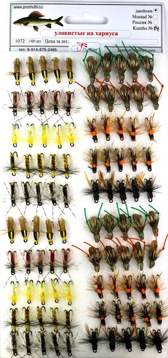 Мухи на двойнике для верховой ловли. Новая серия "Уловистые на Хариуса" вобрала в себя самые проверенные и уловистые мушки. Некоторый верховые модели уникальны и есть только в данном комплекте.
