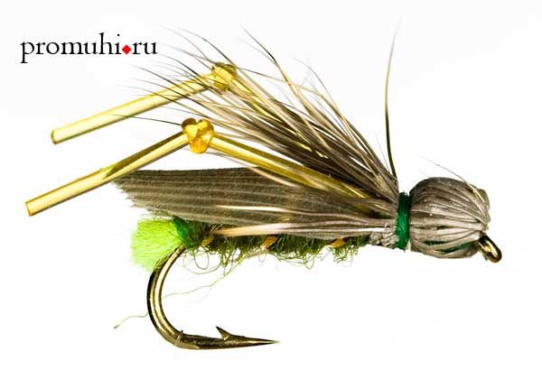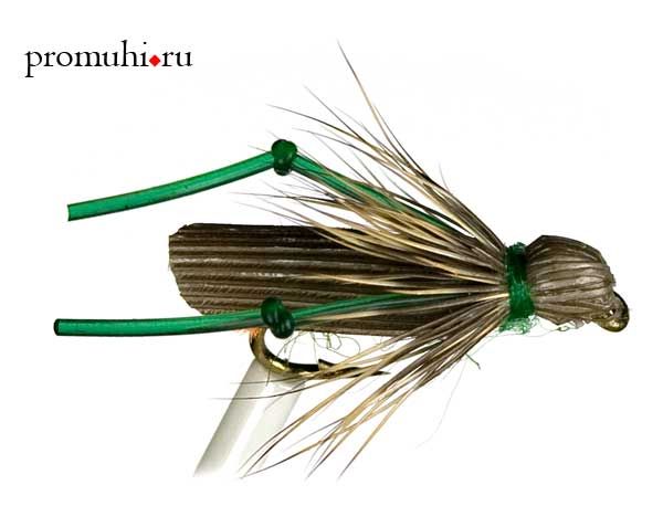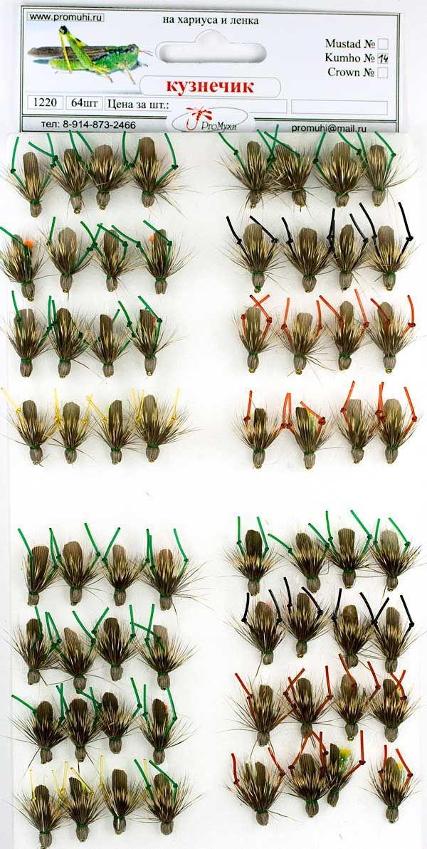 Для рыбалки на равнинных реках, берега которых покрыты травой. Нередко в разгар лета муха кузнечик бывает единственной работающей. Этот вид мушек имитирует виды кузнечиков, которыми питаются рыбы. Собраны основные цветовые варианты окраски встречающиеся в нашей стране. Крючок: Crown