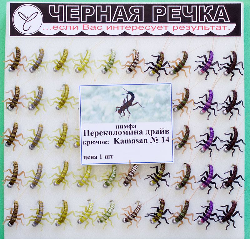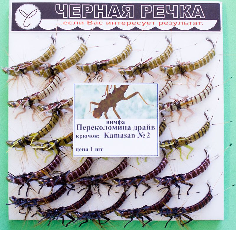 Некоторые некрупные личинки веснянок при движении в воде выгибают тело в сторону спинки, двигаясь животом вниз. Идея подобного движения заложена в концепцию Переколомины драйв. По сравнению с классической Переколоминой мушка упрощена — вместо внедрения под ПВХ-пленку рисунок наносится уложенными специальным образом витками монтажной нити. Это уменьшило себестоимость изделия, а значит, и его отпускную цену. На крючке, правда, экономить не стали — Kamasan B110 великолепен по остроте и прочности. Практика на водоемах показала, что, задуманная первоначально как имитация небольшой группы организмов, эта нимфа может имитировать широкий спектр насекомых: веснянок, поденок, кузнечиков и, возможно, даже некоторых жуков. Переколомина драйв много лет держит первенство по продажам среди всех мушек «Черной речки», что, несомненно, вызвано ее повышенной уловистостью и возможностью всесезонного применения.