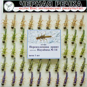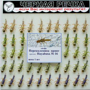 Большинство личинок веснянки при движении в воде плывут животом вниз с прямой спинкой. Классическая Переколомина, помещенная на поводок, оказывается спинкой книзу и имитирует, таким образом, мертвую или оглушенную личинку, несомую потоком воды. Переколомина Принт исполнена спинкой в сторону жала крючка, поэтому на снасти занимает положение, характерное для живой плывущей нимфы. Рисунок нанесен типографским путем непосредственно на пленку, покрывающую спинку нимфы.