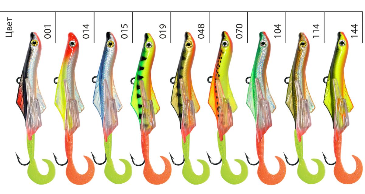 Девять различных топовых расцветок для различных условий освещенности и прозрачности воды позволят Вам подобрать оптимальный вариант приманки для конкретных условий ловли.