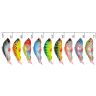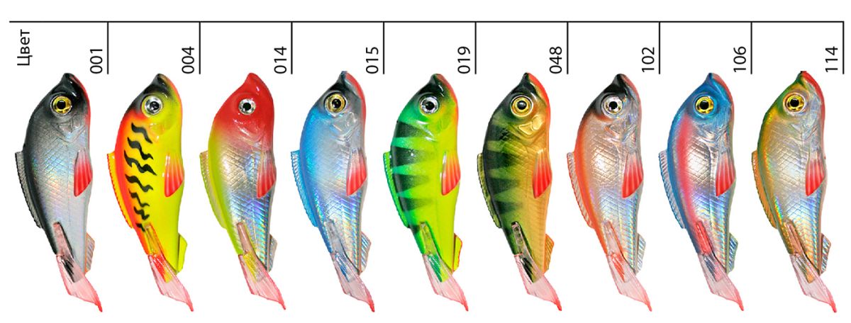Девять различных топовых расцветок от спокойной «плотвиной», реалистичного или огненного окуня и до ярких, «кислотных» флуоресцентных для различных условий освещенности и прозрачности воды позволят Вам подобрать оптимальный вариант приманки для конкретных условий ловли.