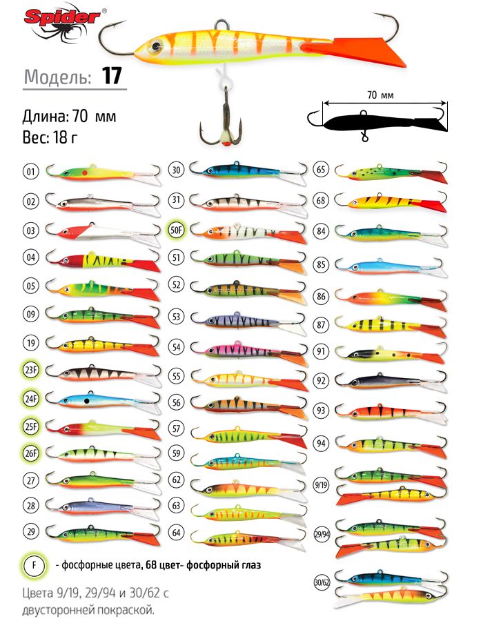 Приманка оснащена двумя качественными высокопрочными крючками от японской компании Maruto. Хвост балансира сделан из прочного морозостойкого пластика и не становится хрупким на холоде, что повышает надежность и срок эксплуатации. Spider Pro 17 окрашивается в контрастные уловистые цвета с применением флуоресцентных UV красок (светятся в ультрафиолетовом диапазоне).