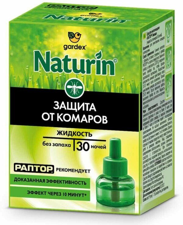 Gardex (Гардекс) Naturin жидкость от комаров (30 ночей) - простое в использовании и крайне эффективное средство для уничтожения назойливых паразитов. Не доставляет каких-либо неудобств во время эксплуатации и абсолютно безопасен для всех домочадцев. В кратчайшие сроки помогает избавиться от кровопийц и предотвратить их повторное нашествие на протяжении всей ночи. Препарат отлично справляется со своей работой при открытых окнах. Рекомендован к применению в помещениях любого предназначения. Буквально через 5 минут средство начинает работать на максимальную мощность, а полное уничтожение комаров происходит через 20-30 минут после включения фумигатора в сеть.