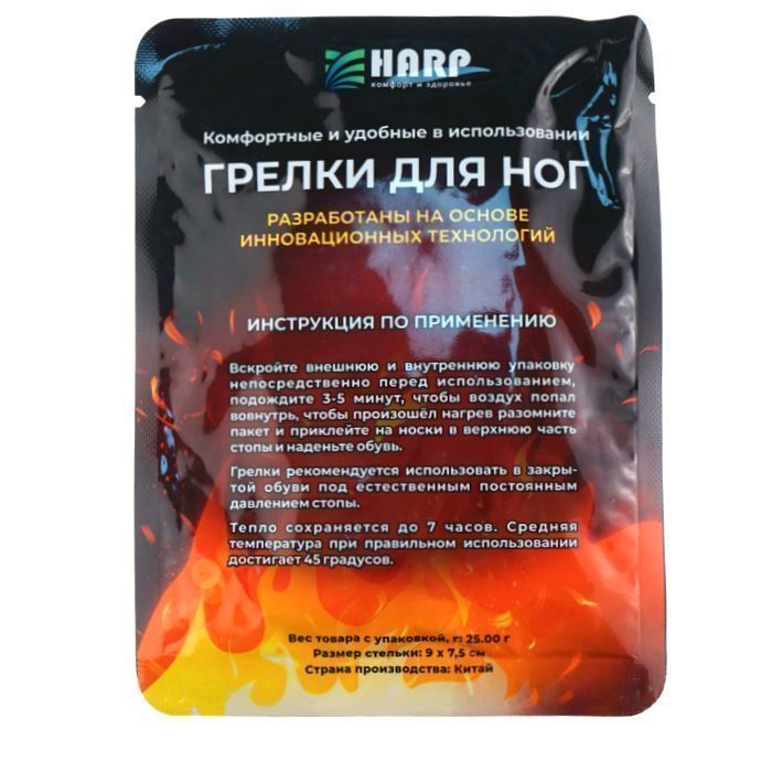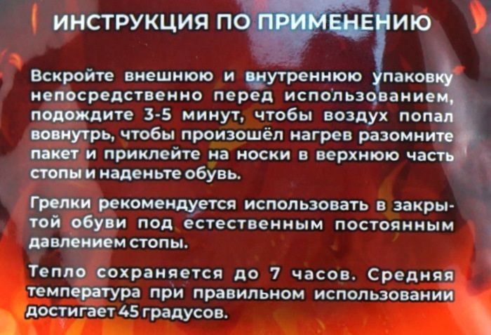 Грелка для ног самонагревающаяся. Для прогулок, активного отдыха, рыбалки и охоты, туризма, для работы на открытом воздухе. Для активации грелки следует открыть упаковку, достать, оставить на воздухе в течении 3-5 минут, чтобы произошел нагрев разомните пакет и приклейте на носки в верхнюю часть стопы и наденьте обувь. При снижении температуры грелки проверить доступ кислорода и встряхнуть. Грелки рекомендуется использовать в закрытой обуви под естественным постоянным давлением стопы.