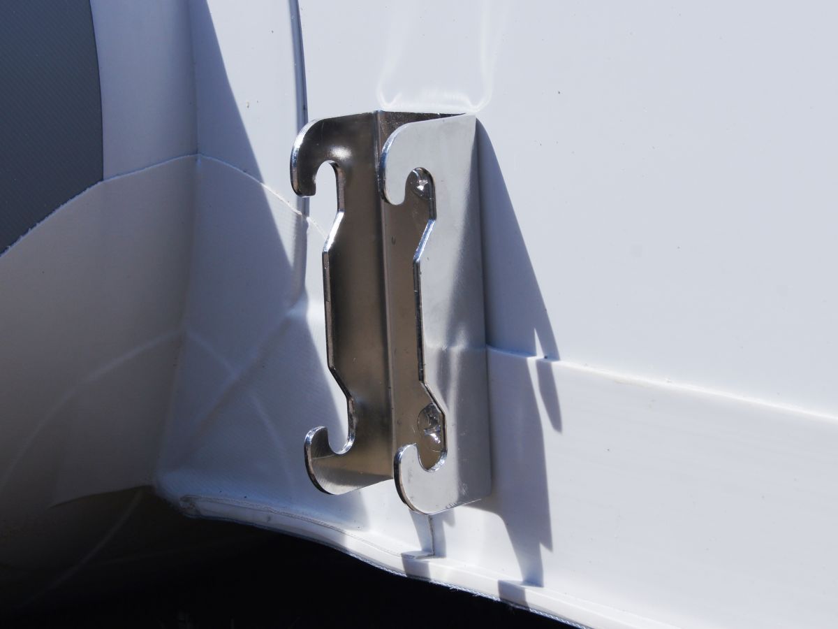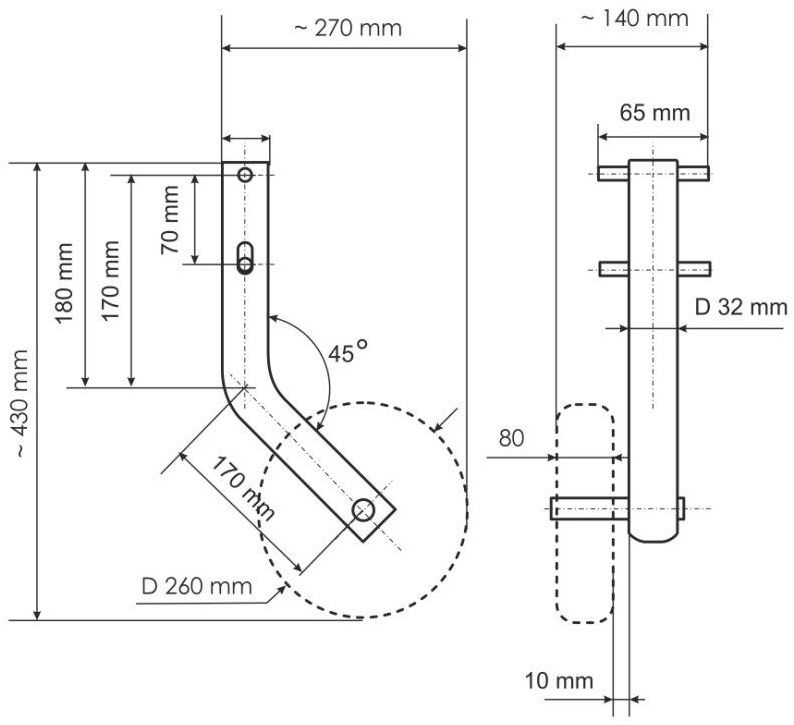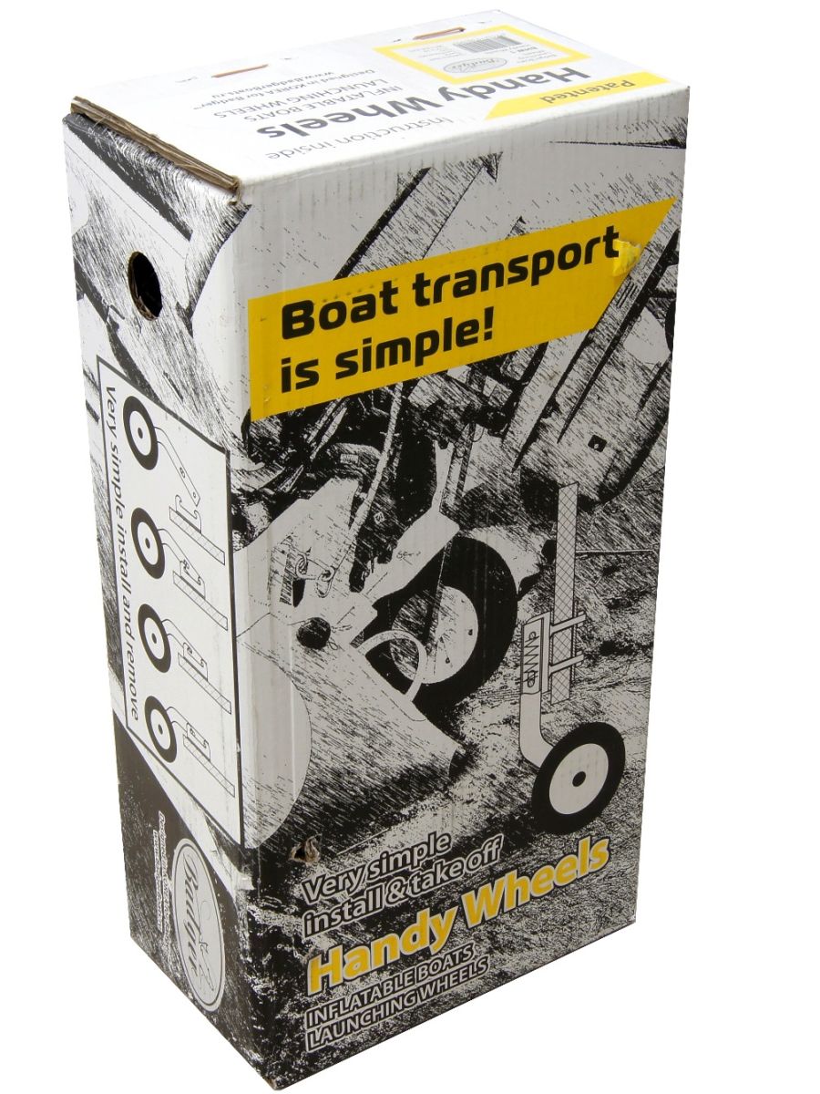 Комплект съёмных колёс Handy Wheels для установки на транец лодки ПВХ включает две стойки из нержавеющей стали, оснащённые одинарными пневматическими колёсами и замками, а также П-образные накладки для установки на транец, болты для их крепления и инструкцию.