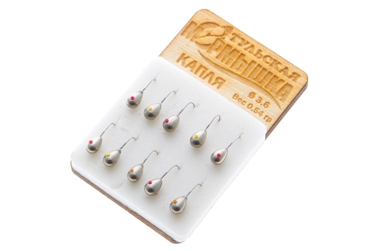Самая распространённая, как у рыболовов-любителей, так и у спортсменов мормышка «Капля» выпускается в размерах от 0,54 гр. и более. Изготавливается из вольфрама с отверстием в центре в который вставлен кембрик для исключения перетирания лески о металл. Материал приманки, это довольно крепкий, с долгим сроком эксплуатации, метал, который не влияет на химический состав воды, а значит и не отпугивает рыбу. Основные цвета серебро (вольфрам), медь, и «черное золото».