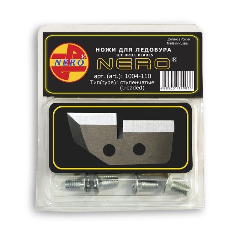 Ножи NERO ступенчатые 1004-110 подходят к отечественным ледобурам для шнеков диаметром 110мм. левого вращения. Предназначены для сухого, промороженного льда. Изготовлены из стали сплава 65Г и нержавеющей стали 40Х13. Наиболее эффективны при работе с родными ледобурами.