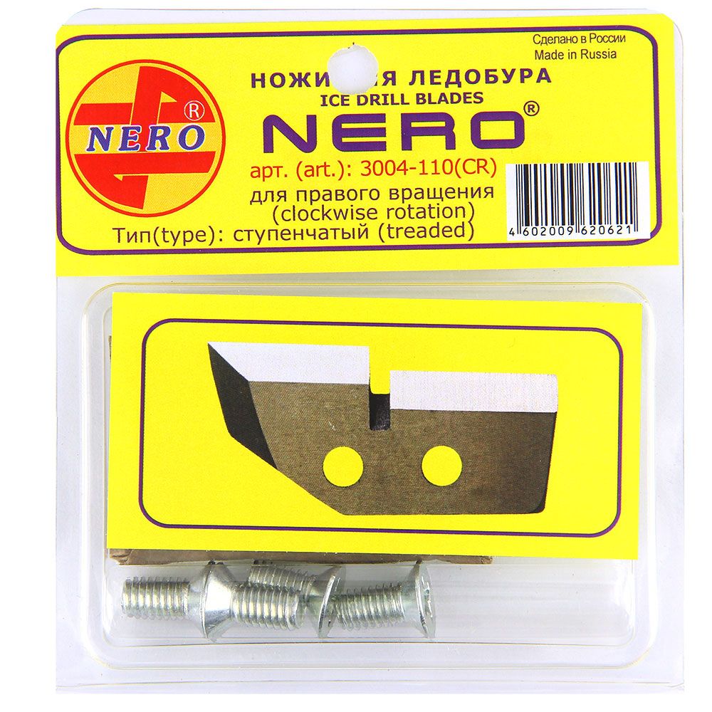 Ножи NERO ступенчатые 3004-110CR  предназначены для шнеков диаметром 110мм. правого вращения.Подходят для бурения сухого, мороженного льда. Предназначены для буров с плоскими площадками рабочей части, с межцентровыми расстояниями отверстий крепления 16 мм. Изготовлены из стального сплава 65Г и нержавеющей стали 40Х13, устойчивы к коррозии.