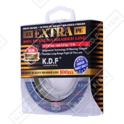 KDF Extra - плетеные шнуры с хорошими показателями прочности и износостойкости. Восьмижильный шнур имеет плотное плетение. Это делает поверхность лески более ровной и гладкой, что положительно сказывается на качестве заброса. Характеристики: