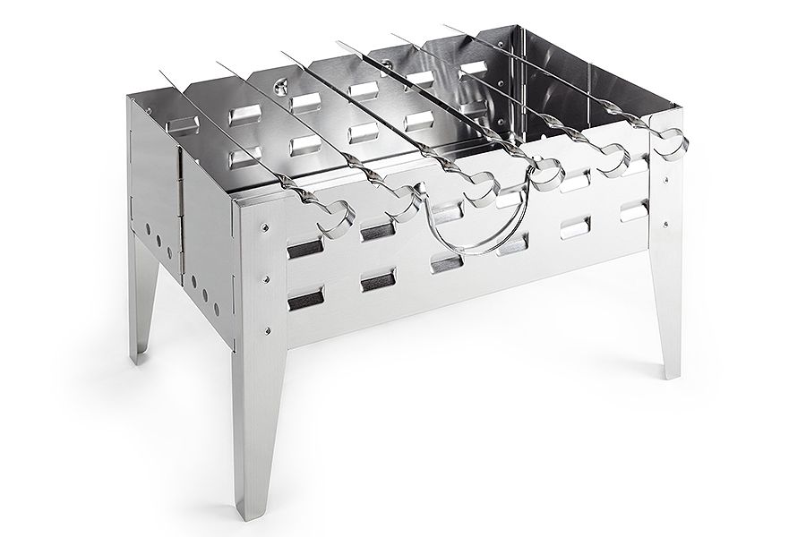 Удобный мангал из нержавеющей стали для загородного отдыха и пикника. В сложенном состоянии трансформируется в чемоданчик размером 51 х 32 х 5,5 см. при весе всего 3.3 кг. и удобно переносится за ручку в сумке, входящей в комплект. Сборка мангала происходит всего за 30 секунд (!) после чего он полностью готов к работе. Рабочая площадь мангала составляет 51 х 32 см. и вмещает до 6 шампуров (входят в комплект). Мангал имеет фигурные вырезы для фиксации шампуров в различных положениях.