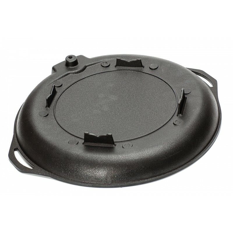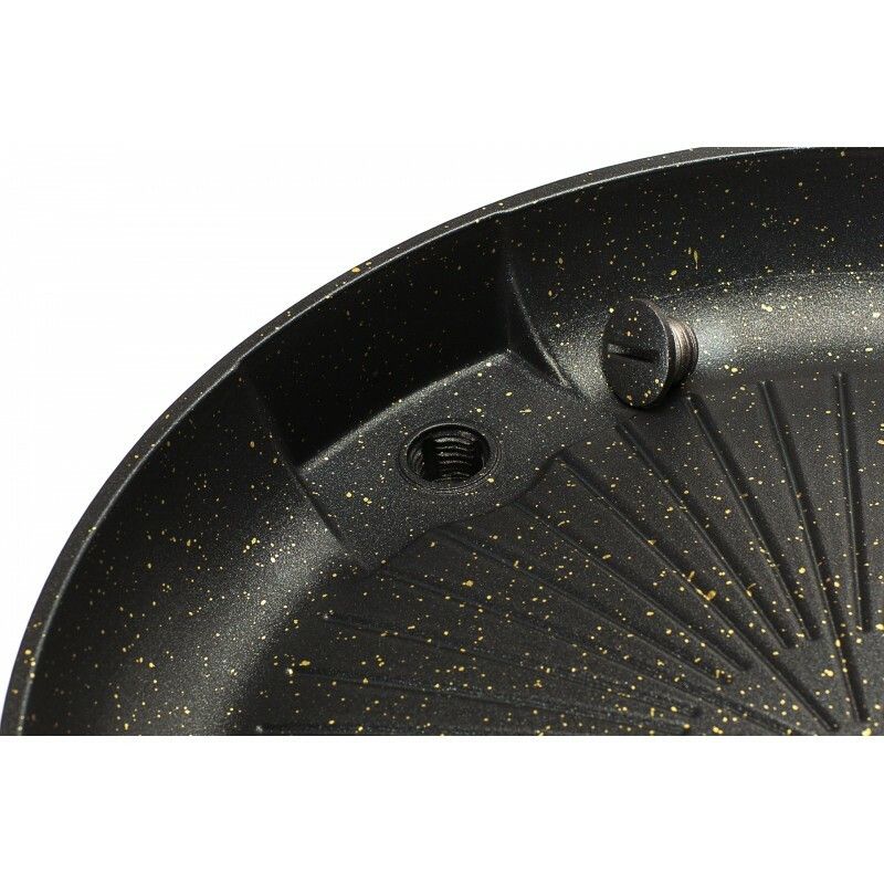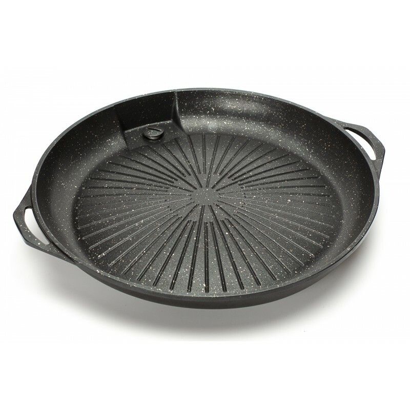Сковорода из литого алюминия и поверхностью с антипригарным покрытием для легкой очистки. Оснащена сливным клапаном для масла. Идеально подходит для использования с газовыми плитами.