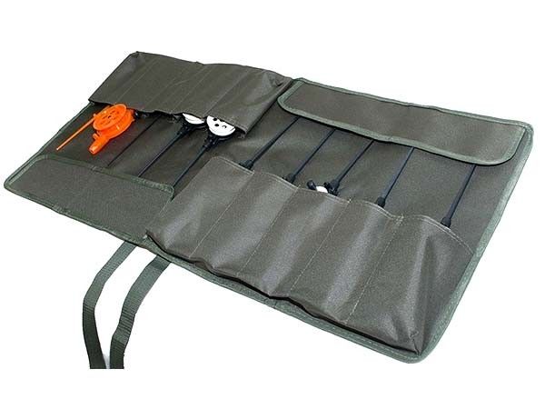 Чехол-скрутка на 10 зимних удочек. Чехол компактно скручивается и застегивается на пряжки. Имеет ручку для переноски.