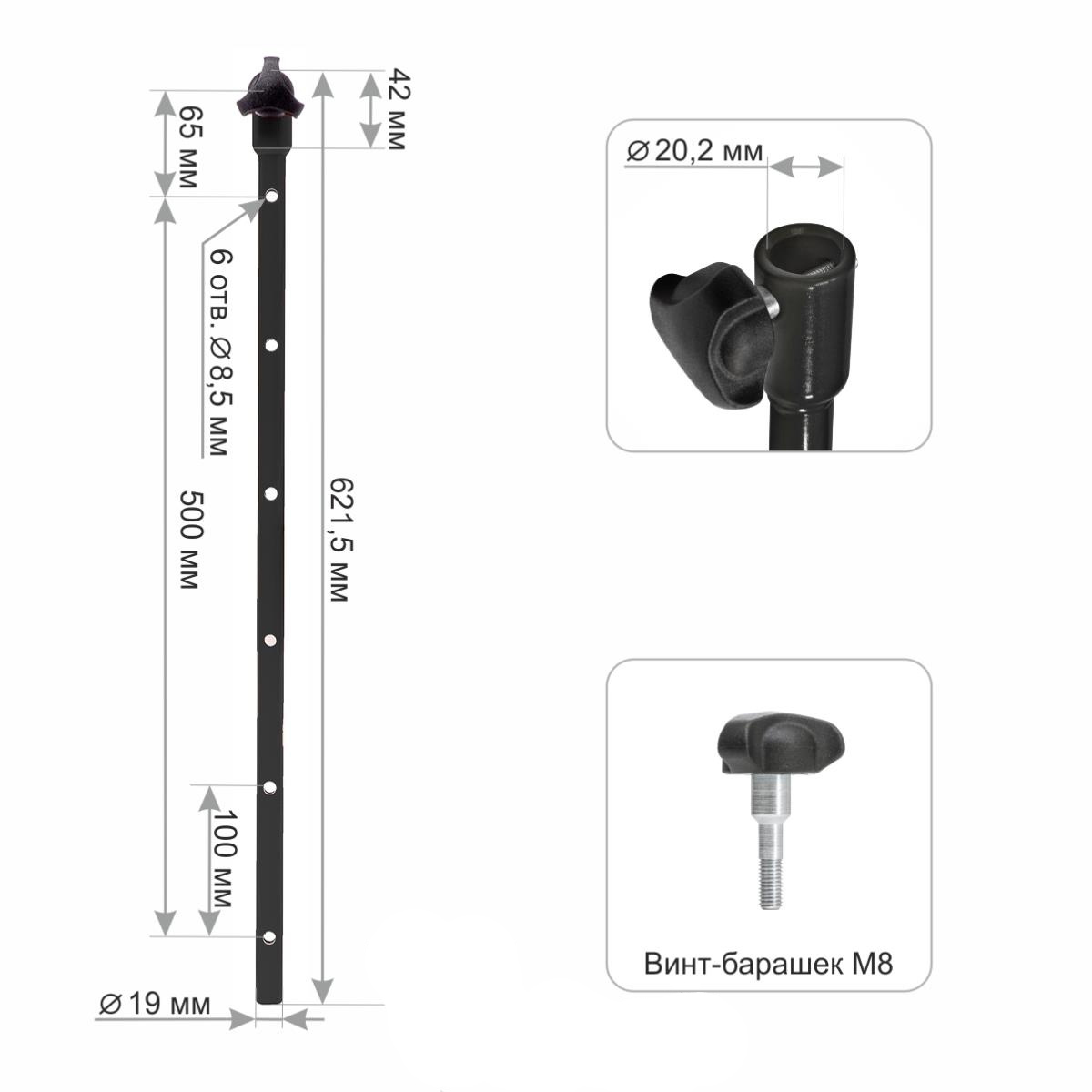 - Диаметр отверстия для фиксации винтом-барашком: 8.5 мм.